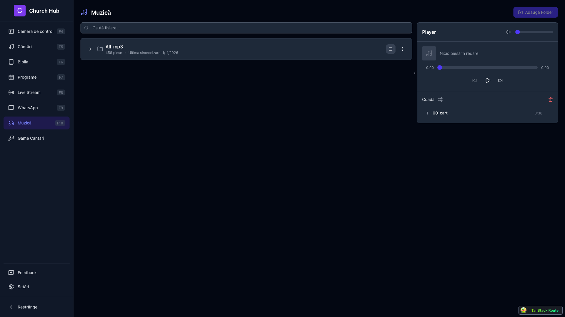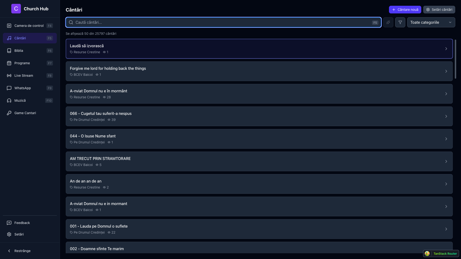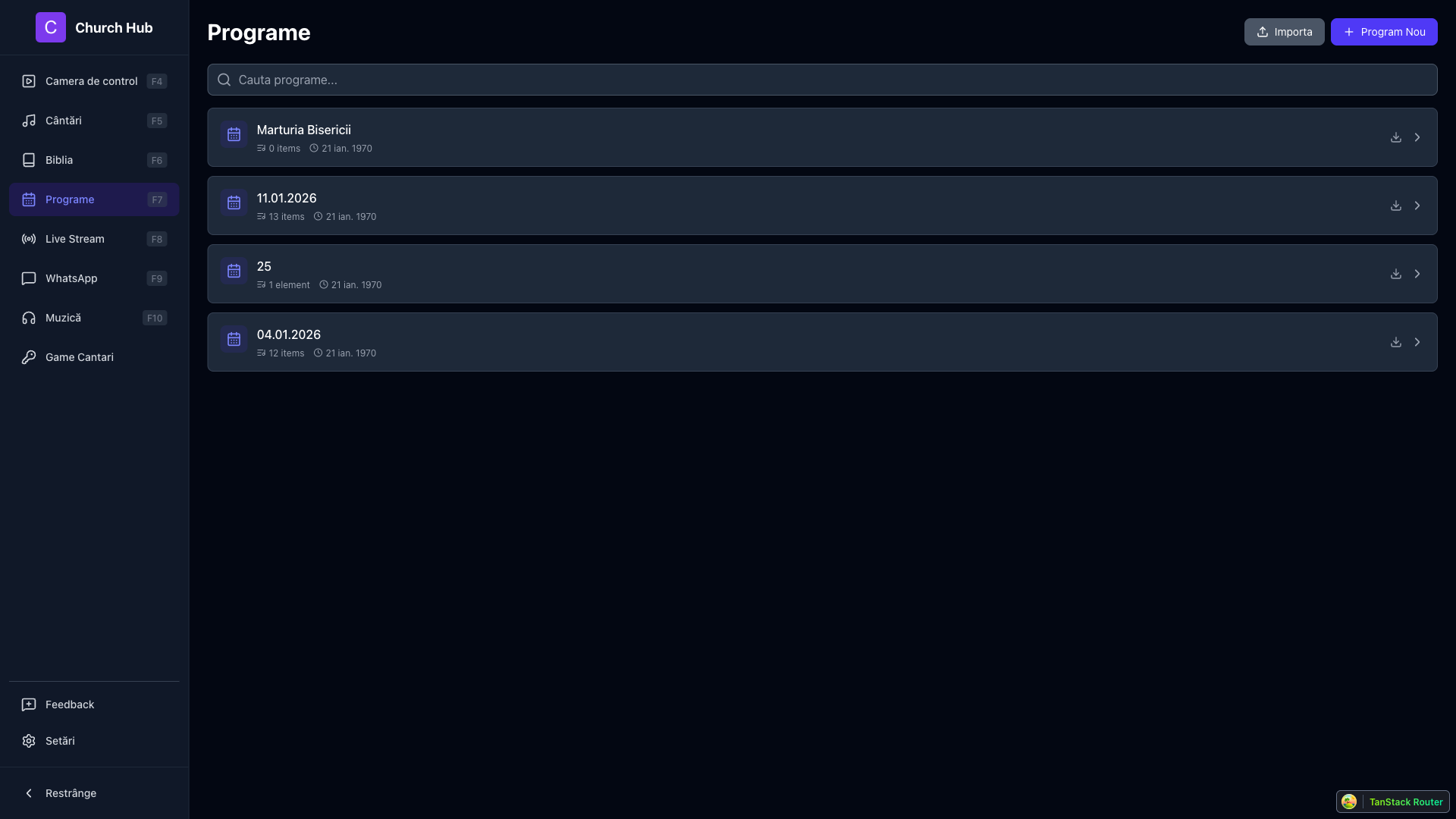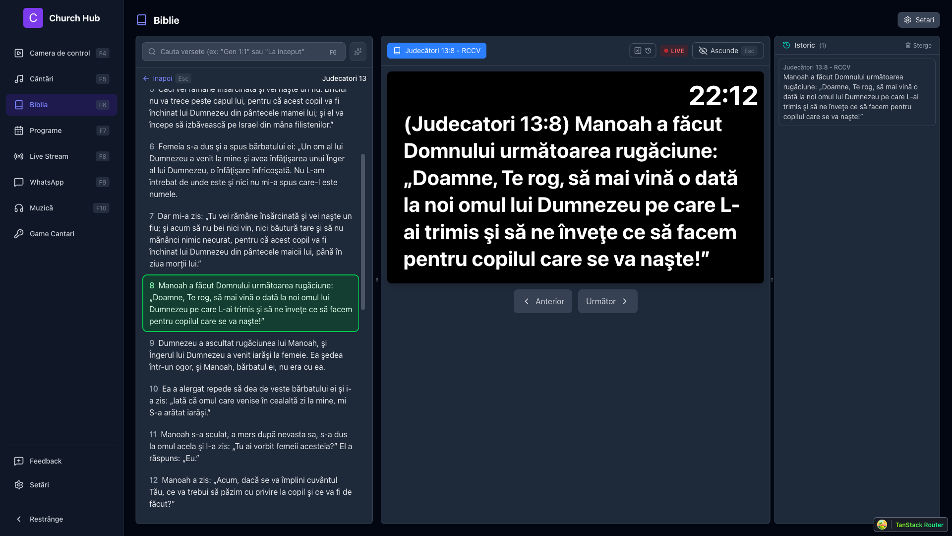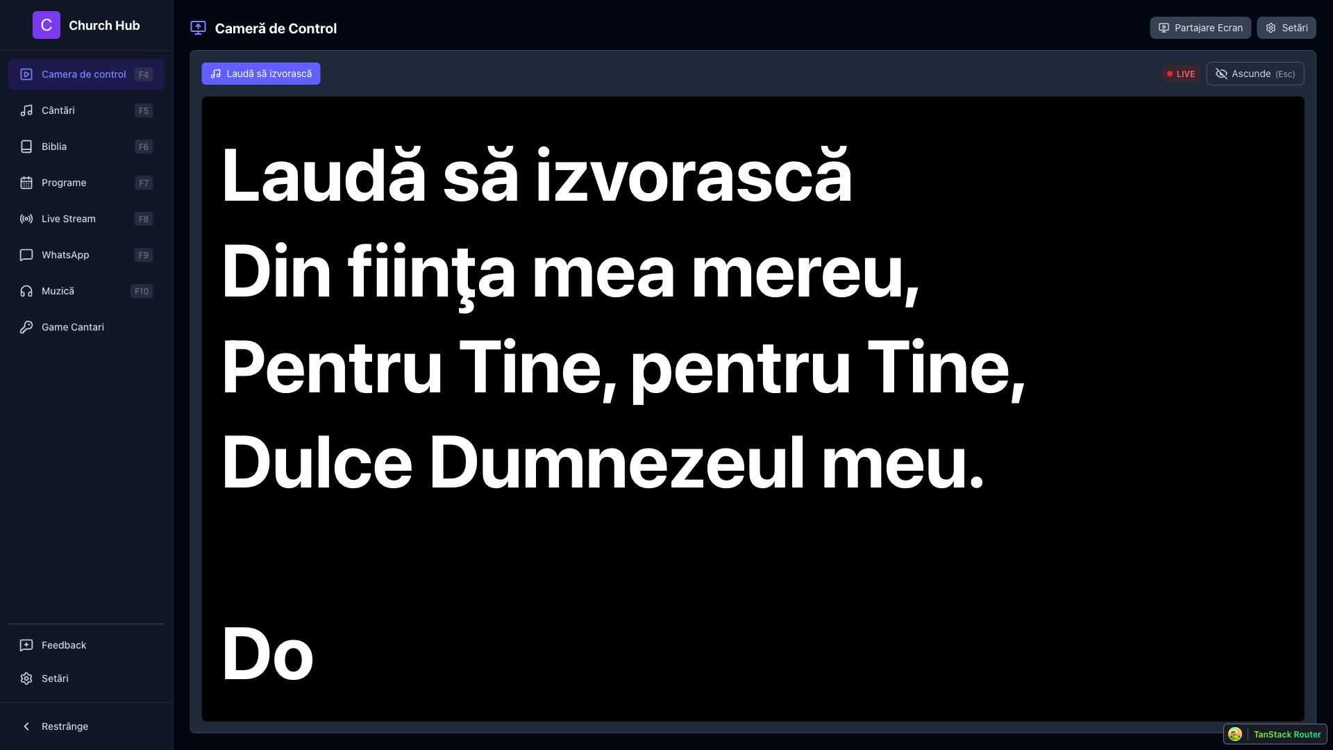 Sistem modern de prezentare si management pentru servicii de inchinare. Combina gestionarea cantarilor, afisarea versetelor biblice, programarea serviciilor, prezentarea multi-ecran si integrarea livestream intr-o singura aplicatie.